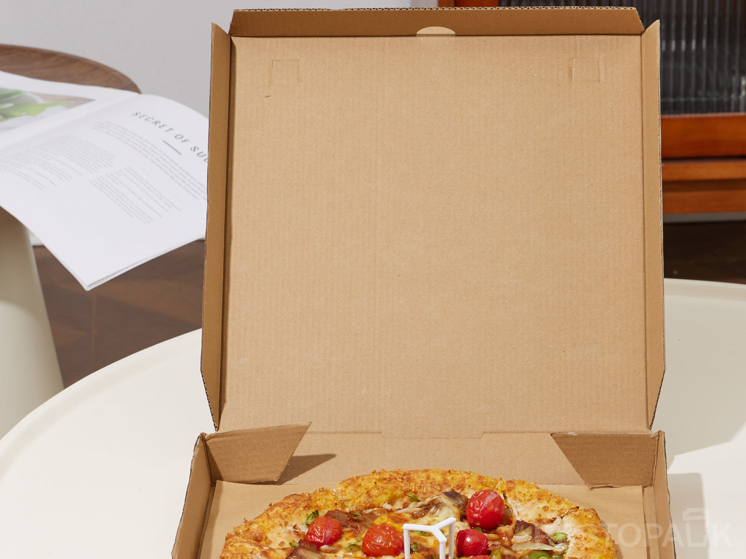 Thepizza boxfeatures afront tabfor secure closure and effortless opening. Keeps pizzas in place, reduces spills, and provides apractical, user-friendly packagingsolution for restaurants, pizzerias, and delivery services.