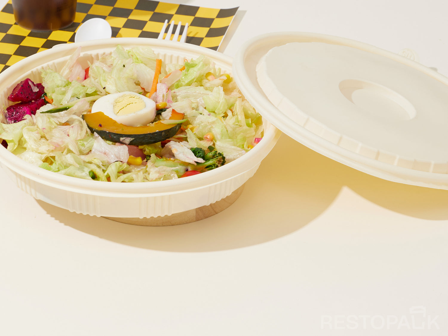 Our salad bowls are made from cornstarch-based material and PP (polypropylene). The cornstarch material is eco-friendly, biodegradable, and safe for food contact, while the PP layer provides extra strength, heat resistance, and leak protection — making the bowls durable and suitable for both hot and cold foods.